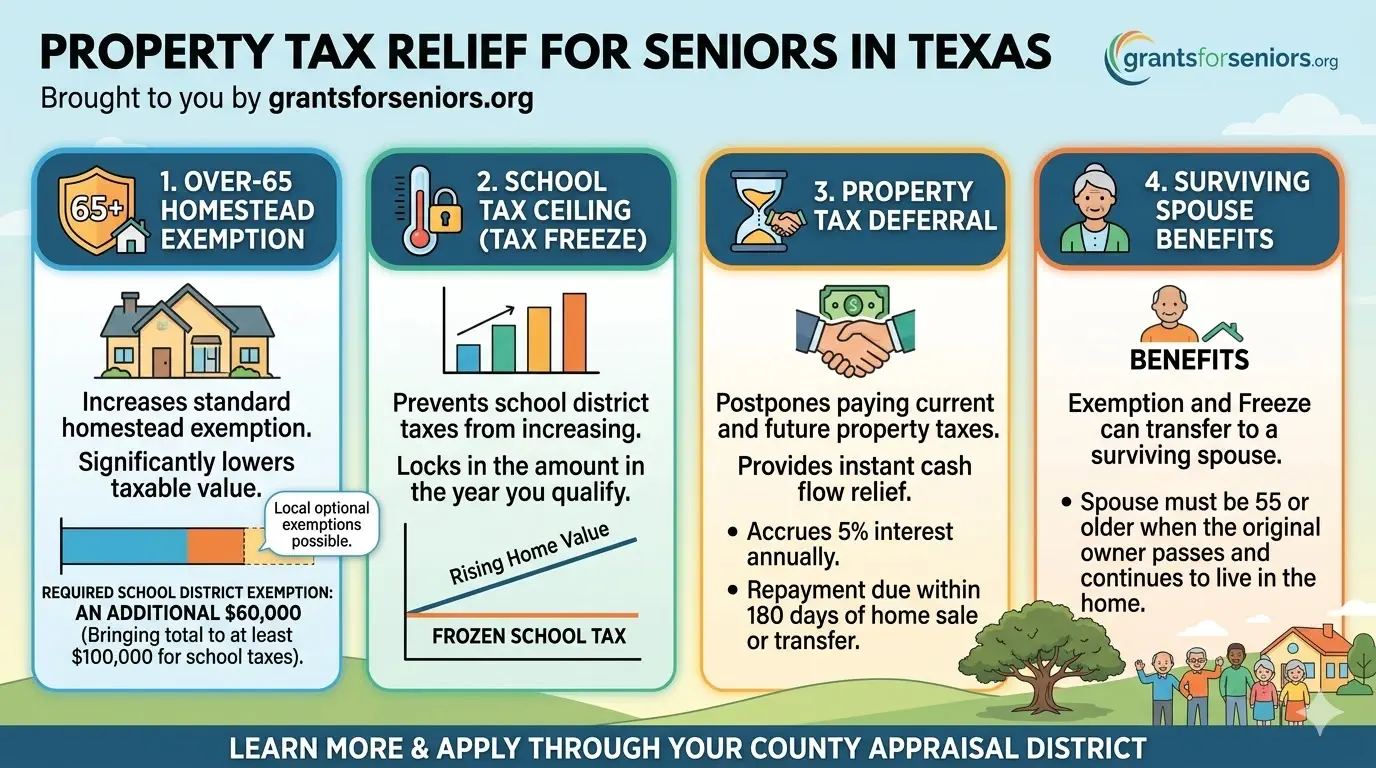 Important: As of March 2026, we could not verify a statewide senior rebate check or a statewide senior homestead circuit-breaker credit on the official Texas Comptroller exemption, payment, or valuation pages. Texas relief is mainly built around exemptions, tax ceilings, installment plans, and deferrals.