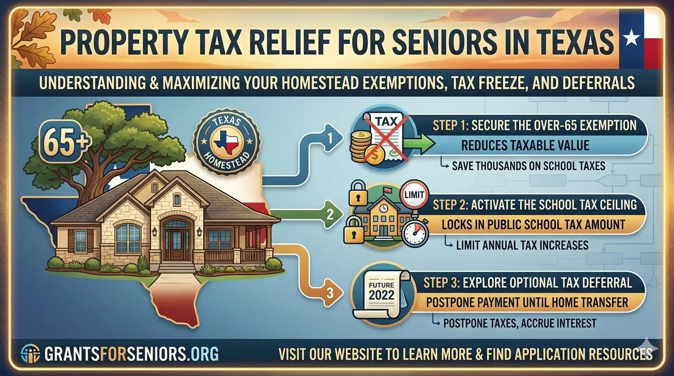 - Best immediate takeaway: If you qualify, the most valuable Texas senior tax break is usually the over-65 exemption plus the school tax ceiling.