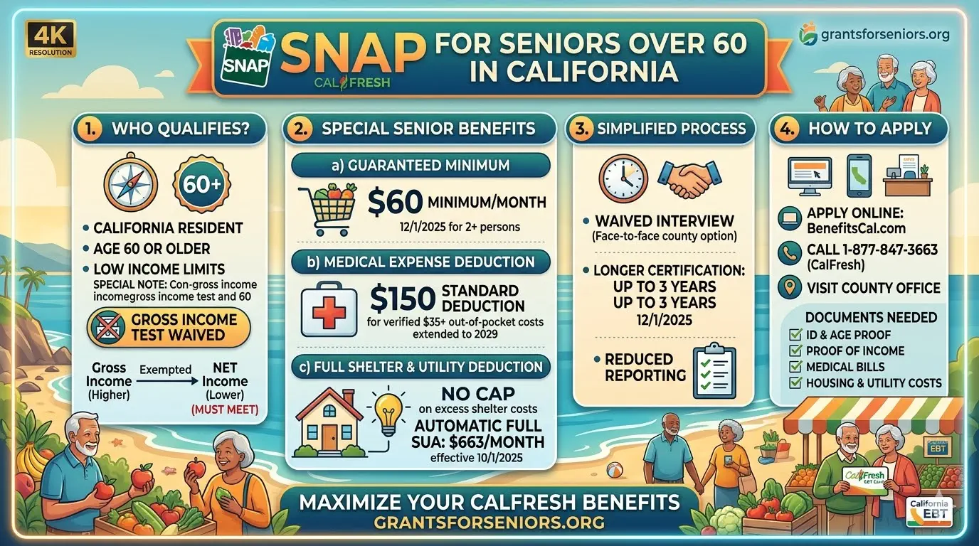 Bottom Line: In California, SNAP is called CalFresh. Seniors age 60 and older often have a better chance of qualifying than they think because California gives older adults easier rules, including no gross-income test for age 60+ households, a simplified application for some older or disabled households, and extra deductions for medical and housing costs. The fastest move is to file an application now, list every out-of-pocket medical and shelter expense, and ask for a phone interview if getting to the county office is hard.